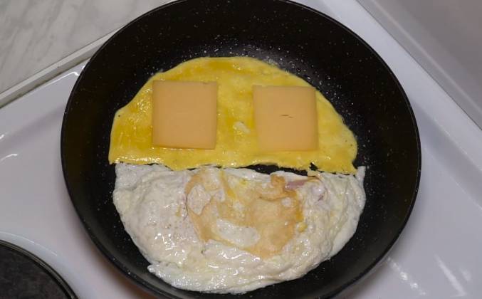 2. Вторым коржом укрываем первую половину. Ничего страшного, как и с блинами первый блин комом. Никто и не заметит! Теперь можно переходить к желтку, им заполняем пустую половину сковороды. На него тоже кладем одну из начинок и на него же перекладываем первые коржи.