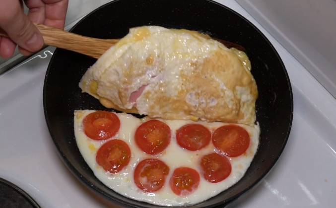 3. Важно, что всегда более старую часть необходимо укладывать на более новую половинку так продолжаем пока не закончатся все яйца или начинка. Можно импровизировать в очерёдности слоев и в начинке, как угодно. Для меня же важно, когда я это готовил, что в итоге можно ровно по середине разделить данное блюдо на две половины и подавать ровно двум персонам. Многослойный завтрак из яиц с начинкой готов!Видео рецепт ютуб ниже 👇