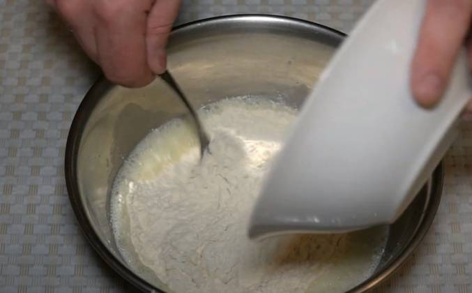 2. Добавляем муку смешанную с разрыхлителем. Ещё немного соли, и специи, в нашем случае, это смесь прованских трав. Всё тщательно перемешиваем и можно объединять с заготовками. Куриное филе и сыр натертый. Емкость для запекания разотрем маслом сливочным и выкладываем нашу смесь теста, курицы и сыра.