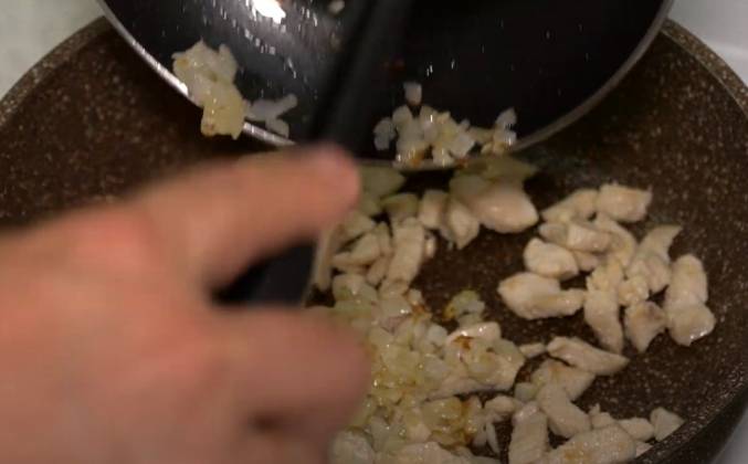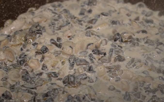 2. Переходим к луку репчатому, его нарезаем мелко и переходим дальше, к следующему ингредиенту. Грибы шампиньоны. Их тщательно промываем и тоже нарезаем довольно мелко. Разогреваем сковороду и в растительном масле обжариваем грибы, они конечно же уменьшатся в размерах. Далее, очищаем сковороду и приступаем теперь к обжарке грудки куриной. А параллельно поджарим до легкого золотистого цвета лук ранее измельченный. Смешиваем его с грудкой куриной, туда же добавляем ранее обжаренные грибы. Еще добавим немного соли и перца черного. И теперь самое важное. Это сливки. Вы спросите почему самое важно.