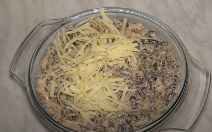 3. А потому что, как я говорил ранее, мы готовим жульен не в классическом жидком состоянии начинку. Для дальнейшего приготовления порционно или вообще более классически, необходимо количество сливок увеличить в 2 раза, как минимум. Ну а мы тем временем, раскладываем начинку в емкость для будущего запекания. Остается добавить сверху сыр полутвердый натертый и всё. Духовка уже разогрета до 180 градусов, ставим буквально на 10 минут. Напомню, что подают жульен обязательно горячим.Видео рецепт ютуб ниже 👇