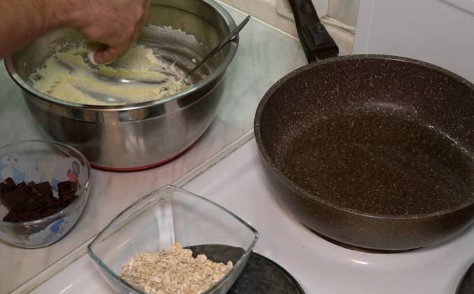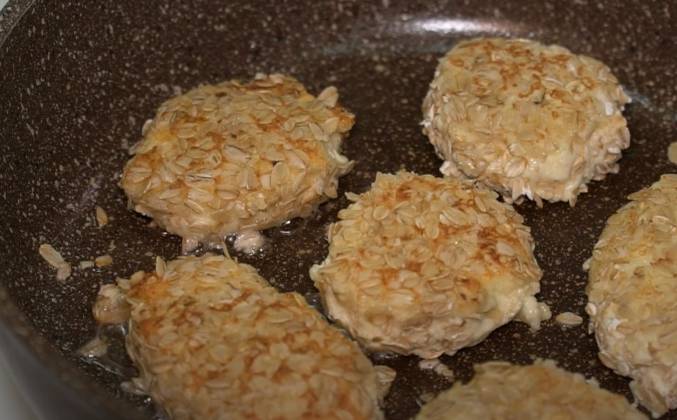 2. Ну а в качестве панировки будем использовать обыкновенную овсянку геркулес. Она создаст отличную корочку у будущих сырников. Приступаем к обжарке, для этого сначала сформируем заготовку будущего сырника. Мокрыми руками формируем из теста, в центр кладем пару кусочков шоколада. Остается только обвалять в панировке из хлопьев и можно жарить на растительном масле на среднем огне.