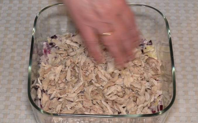 Салат грибы с курицей и сыром слоями