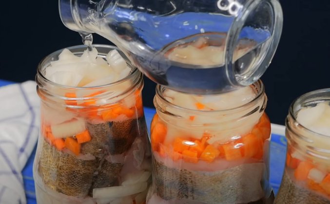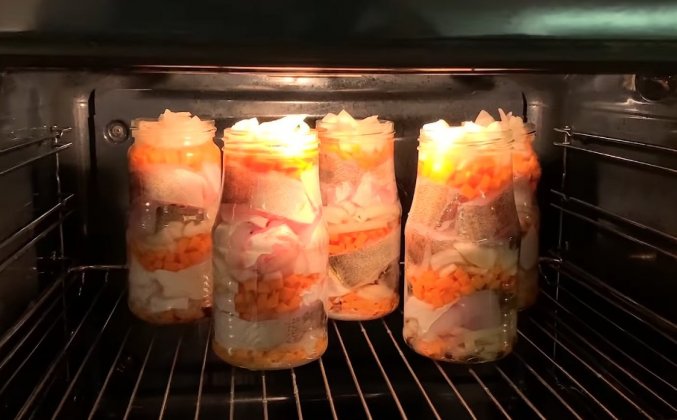 2. Судака буду готовить с овощами и укладывать рыбу и овощи буду слоями. Насыпаю горсть нарезанной кубиками морковь, и далее нарезанный лук, теперь несколько кусочков рыбы, стараюсь уложить их плотно друг другу. Сверху морковь и лук, снова слой рыбы и самый верхний слой снова овощи. В каждую банку почти до верха Вливаю немного воды. Таким же образом наполняю все банки. У меня получилось 5 штук. Банки ставлю в холодную духовку и включаю нагрев до 160 градусов, когда жидкость внутри банок закипит, то есть начнет булькать ,сразу Убавляю температуру примерно до 110- 115 градусов. Жидкость внутри банок должна лишь слегка булькать. В моей духовке это происходит именно на таких температурах.