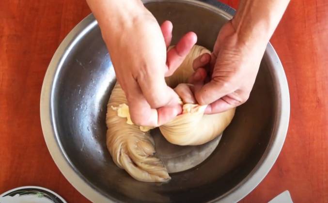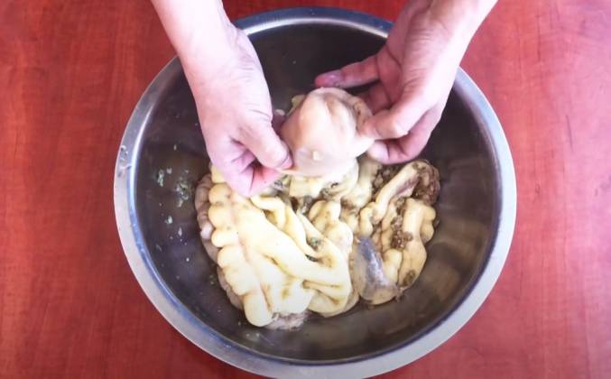 2. Это окончательно удалит всю слизь, оставшуюся в складках кишки, а также практически удалит специфический запах. Теперь Қарта нужно вывернуть жиром наружу и так же все хорошо промыть в чистой проточной воде. В процессе забоя и разделки животного на жир могли попасть мелкие камешки, косточки и сено. Поэтому жир тоже хорошо промываем. Промытый Қарта можно готовить сразу. Слегка натереть его солью, завязать с двух сторон и варить до готовности. Но я предпочитаю Қарта промариновать, что придаст Қарта дополнительный вкус и аромат. В отдельную посуду выдавливаю через пресс чеснок, добавляю черный перец и соль, все хорошо перемешиваю. Этой смесью натираю саму кишку и жир.
