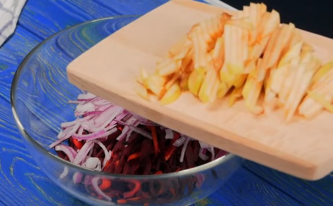 2. После запекания, остужая овощи до комнатной температуры, выкладываю в салатник тонкими четверть кольцами режу красный сладкий лук, и еще в этот салат я кладу нарезанный брусочками кисло-сладкое яблоко, у меня спелая очень сочная антоновка. Селедка у меня как раз готова, хорошо засолилась, промариновалось!
