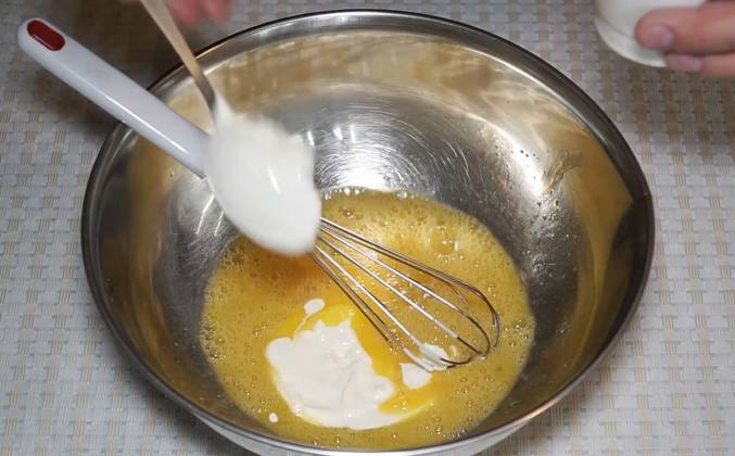 2. Так же в будущее тесто добавляем 100 грамм сметаны и 250 миллилитров муки просеянной. В итоге заготовка должно иметь кремовую текучую, ну почти кремовую структуру. На секунду вспоминаем, что у нас варились яйца куриные для начинки, как раз они уже лишились скорлупы и остыли, поэтому пора их измельчить и добавить к луку, который не забываем посолить, а то начинка будет пресной на вкус.