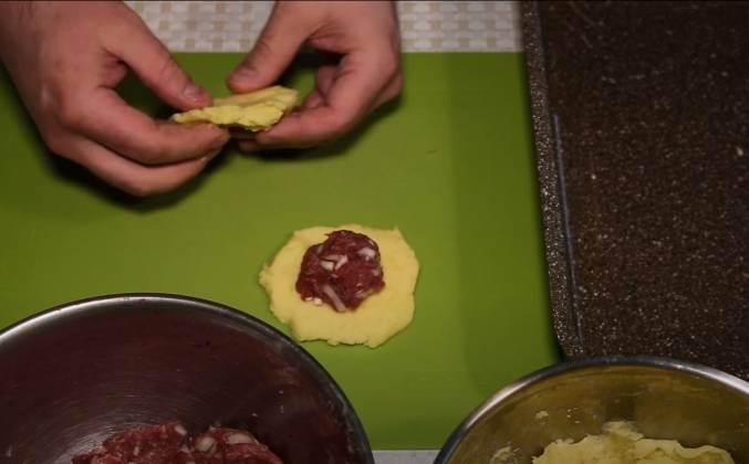 2. Вспомним на минутку о картофеле и посолим его, прежде чем снимать с огня. Сливаем воду, остужаем и толчем с добавлением одной столовой ложки муки и одного куриного яйца. Перейдем к самому интересному, начнем лепить шарики. Из картофельного теста раскатываем небольшие лепешки, одну снизу, вторую сверху, а в центр помещаем шарик из фарша. Соединяем слои сформировав шарик. Да, чуть не забыл, противень смажем сливочным маслом, оставляя между шариками небольшое расстояние.