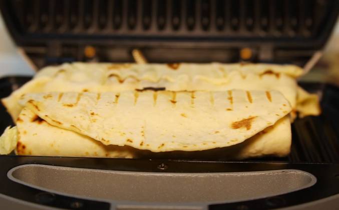 4.  Загибаем одну из боковушек – это будет низ, и скручиваем в трубочку. Ничего сложного, главное потратить время и приготовить все ингредиенты. Можно не заморачиваться и использовать покупной лаваш и так же лихо в него все закрутить. Но когда вы хоть раз сделаете на домашнем лаваше, вы уже никогда не вернетесь к покупному. Осталось в конце нашу домашнюю шаурму обжарить на гриле мини бутурброднице, полезная и удобная вещь.Видео рецепт ютуб ниже 👇