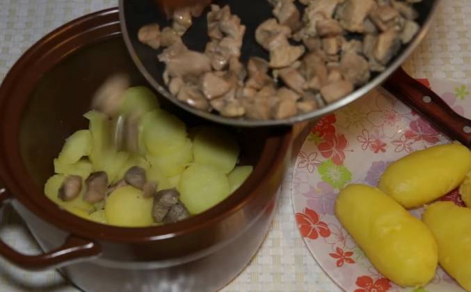 2. И опять оставим на огне до почти полного испарения влаги. Не забываем посолить и можно переходить к мясу индейки. Необходимо обжарить его на сильном огне, не забывая тоже посолить. Итак, две главные составляющие у нас почти готовы. Выпариваем всю влагу из мяса и возвращаемся к картофелю, его необходимо, как остынет, конечно же отчистить. Начинаем укладку в горшочки. Хотя нет, в нашем случае это горшок, рекомендую, очень удобный для приготовления не для праздников, а для обычной ежедневной трапезы. Первым делом нарезаем картофель кольцами. Только теперь настало время его посолить, кстати картофеля будет у нас 2 слоя, а между ними как раз уложим филе индейки, по желанию добавим специй типа хмели-сунели и нарежем второй слой картофеля, не забывая тоже посолить.
