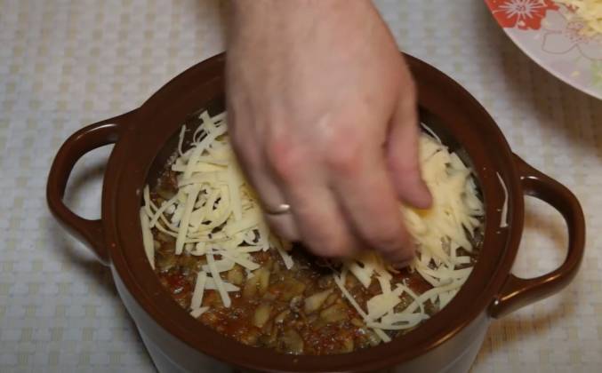 3. Следующими у нас идут грибы и сыр гауда, как шапка укладывается сверху всего этого горшка. Вы спросите, почему всё в сыром виде не положить сразу в горшок, отвечу – можно и так, но если сделать заготовки на сковородках, итоговое блюдо выйдет не просто печеным. Все ингредиенты будут не в бульоне, а ярко отличимые, очень вкусные и нежные. Да, духовка, чуть не забыл, она прогрета до 180 градусов, ставим горшок с индейкой буквально на 20-30 минут и всё!Видео рецепт ютуб ниже 👇