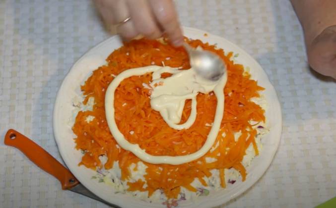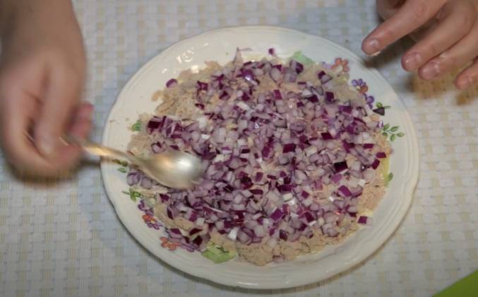 2. Что уж там говорить, хоть красную, да хоть чёрную, если не жалко конечно. Но лучше трески или щучью. Настало время нарезать лук репчатый, мы берем красный сладкий лук. Можно взять белый, но необходимо или обдать его кипятком, или предварительно замариновать его в уксусе, чтоб он не так ярко выделялся в будущем салате. Переходим к яйцам куриным. Натираем их на крупной терке и сверху смазываем очередным слоем майонеза.