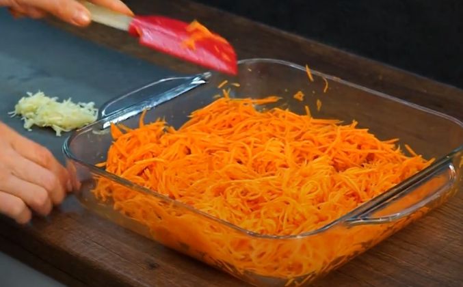 3. При добавлении соли и сахара морковь начинает отдавать свой сок можно его слить и продолжать готовить но я оставлю этот сок, сейчас я собираю морковку в горку, добавляю кориандр по центру и красный перец, а теперь вливаем туда ароматизированное масло прям на эту горку, для того чтобы горячее масло раскрыло аромат специй. Сам лук я не добавляю, теперь перемешиваю морковь чеснок я буду добавлять, когда полностью перемешаю морковь со специями и маслом, сейчас уже можно добавить чеснок и опять все перемешиваю, количество специй можно регулировать по своему вкусу ну вот и все. Морковь по-корейски готова. Очень быстро просто и очень вкусно теперь ее нужно накрыть крышкой или затянуть пленкой и поставить в холодильник на 4 часа, чтобы она пропиталась и настоялась.Видео рецепт ютуб ниже 👇