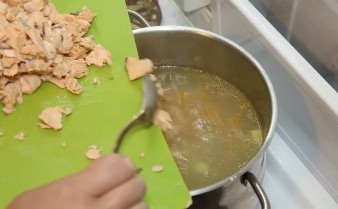 2. Вы спросите, почему кубиками, а не соломкой, а у нас есть правило, если в будущем первом блюде большая часть ингредиентов квадратная, то и картофель должен быть квадратный, а если, например, в борще преобладают вытянутые формы ингредиентов, та же капуста, то и картофель нарезается вытянутым. После 20 минут кипения рыбы, достаем её из бульона и процеживаем его, а рыбу оставляем остывать в сторонке.