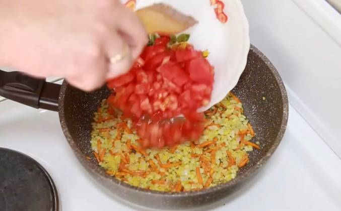 2. Нарежем кубиками помидор и вернемся к субпродукту. Сольем полстакана бульона в отдельную емкость, и охладим сердца, можно под проточной водой. Приступим к нарезке на кольца, параллельно срезая верхнюю часть с сердец – аорты. Перейдем к тушению. Добавив оливкового масла при жарке, вы только насытите вкус блюда, рекомендую. Первым делом обжарим морковь ранее нарезанную соломкой. Примерно через 3 минуты добавим нарезанный лук и продолжим обжарку. Выдавим 2 зубчика чеснока, сщательно перемешаем. Настала очередь томатов.
