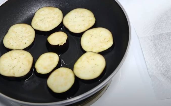 2. На разогретую сковороду добавим растительного масла и раскладываем наши заготовки. Обжариваем с одной стороны минуты 3-4, солим и переворачиваем на вторую сторону. Она тоже требует немного соли. Иначе получится пресной. Как только баклажаны слегка схватятся, снимаем их с огня и раскладываем на салфетку, для впитывания излишков масла.