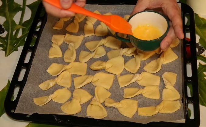2. Далее каждый кусочек скрутим в бабочку. Подготовим противень, намажем яйцом будущее печенье и добавим сахар сверху. В разогретую до 180 градусов духовку поставим на 10-12 минут наши заготовки.Видео рецепт ютуб ниже 👇