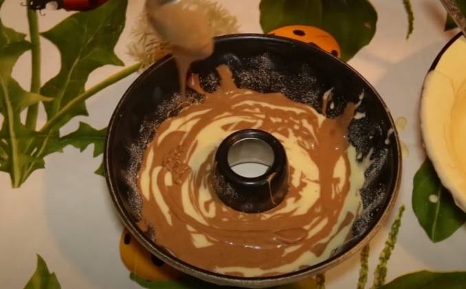 3. Перейдем к самому творческому процессу, поочередно наливаем наше тесто, можно слоями, можно узорами, а можно хаотично, как вашей душе угодно. Тут фантазия повара поистине может себя показать безгранично. В заранее разогретую до 180 градусов духовку ставим пирог на 20 минут. Зебра готова.Видео рецепт ютуб ниже 👇