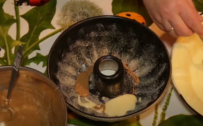 2. Тшательно перемешаем можно рукой, можно миксером. Разделим тесто на две части и в одну из них добавим примерно 1,5-2 столовые ложки какао порошка. Перемешаем до однородной массы и перейдем к форме для запекания. Смажем ее маслом сливочным и присыплем сухарями панировочными, так легче будет потом доставать нашу выпечку из формы.