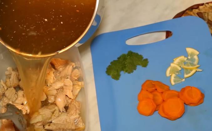 3. Приготовим желатин. Рассчитыва пропорцию необходимо из количества порций жидкости. Мы же используем желирующую смесь состоящую из желатина и мелких сухих овощей-приправ. Главное соблюдать пропорцию указанную на пачке. Тщательно перемешав застывающий бульон, зальем им нашу рыбу. Добавим лимонные дольки, морковь и лепестки петрушки. Убираем в холодильник до полного застывания. Заливная рыба готова.Видео рецепт ютуб ниже 👇