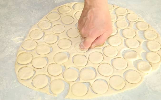 3. Не переборщите с мукой, а то получится очень упругое тесто. Раскатываем на один большой блин, далее рюмкой или маленькой чашкой нарезаем на вот такие круглый заготовки. Не старайтесь делать их слишком тонкими, так как далее как раз мы сначала разминаем заготовку до необходимой толщины, накладываем начинку, в нашем случае картофель с луком, и слепляем края теста вместе. Оно очень хорошо липнет и не раскроется при варке, не бойтесь, если конечно вы все сделали, как я описывал ранее.