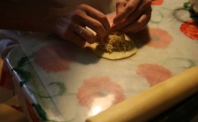 2. Итак берем тесто, как я уже говорил рецепт есть у нас на канале, в подсказках и в описании к этому ролику. Раскатываем скалкой его на круг, укладываем начинку в центр, загибаем с двух сторон края, слепляем их и вот так нехитро закрепляем края вместе, переворачиваем швом вниз и убираем на противень, не волнуйтесь сейчас поближе покажу. Берем тесто, раскатываем в одну сторону, потом в противоположную, распрямляем если требуется руками и кладем начинку. Соединяем края вместе, они легко слепятся с нашим тестом. Еще раз подробнее момент склеивания краев. Скрепляем половинки.