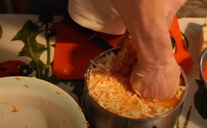 2. Далее необходимо тщательно размять. Именно тщательно, чтоб капуста была на грани пустить сок. Далее выложив все кастрюлю для закваски продавим капусту кулаком. После первого захода сока конечно еще не будет, но далее вы увидите, что после третьей закладки и размятия содержимого кулаком, капуста даст естественный сок и его будет очень много! Данную процедуру мы повторяем три раза, как раз до самого уровня кастрюли. Повторю еще раз: режем капусту, добавляем морковь, немного солим, перемешиваем и тщательно жмем перед укладкой в кастрюлю, далее не менее тщательно продавливаем кулаком, вот и третий заход настал, посмотрите как много сока. Теперь накрываем тарелкой, продавливаем до упора и кладем груз.