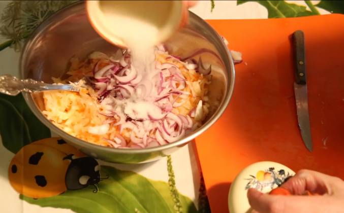 4. Да и салат простейший из квашеной капусты делается холодным. Берем сквашенную капусту уже охлажденную, нарезаем лук, желательно сладкий ялтинский, разминаем его, добавляем в капусту, добавляем сахара и польем все маслом подсолнечным. Тщательно перемешиваем и всё. Всем приятного аппетита. Конечно из квашенной капусты можно много что сделать, те же щи сварить, например, но это совсем другая история.Видео рецепт ютуб ниже 👇