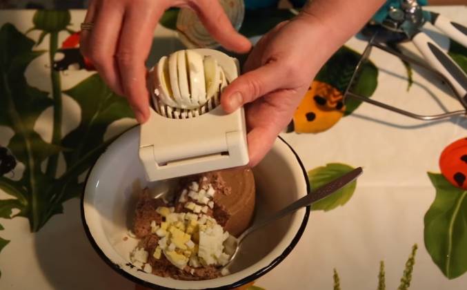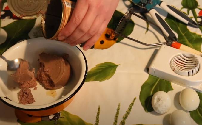 2. Нарезаем яйцерезкой яйца куриные с трех сторон, напомню, что на банку печени нам понадобится 3 штуки. И тщательно перемешиваем. Вот и всё!