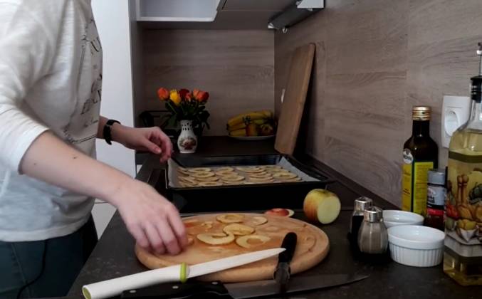3. Ок да, чувствую, что я яблок наемся ещё до чипсов застилаем противень пергаментом оп и выкладываем каждую по отдельности чипсину будущую переворачивать их не нужно будет по этому утрамбовываем и утрамбовываем ну всё, у меня всё забито уже ставим в духовку при 100 градусах на час и потом смотрим у меня в режиме конвекции на средний уровень два яблока, вот вот всё, что получилось из двух яблок на этом можно остановиться чипсы готовы но если вы хотите прям что-то сладкое берём 1 ч. ложку сахарной пудры и немного корицы если вы не любите корицу, ну не кладите корицу не надо проблемы создавать себе лишние получается, 1 ч. ложку корицы без верха я положила перемешаем и... собственно посыпим.
