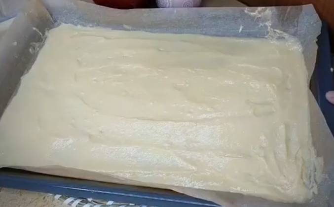 3. Даём полностью остыть м смазываем любым джемом или варёной сгущёнкой. Размер противеня стандартная 35×45 Размазывайте по противеню , тесто поднимается, не переживайте.Видео рецепт ютуб ниже 👇