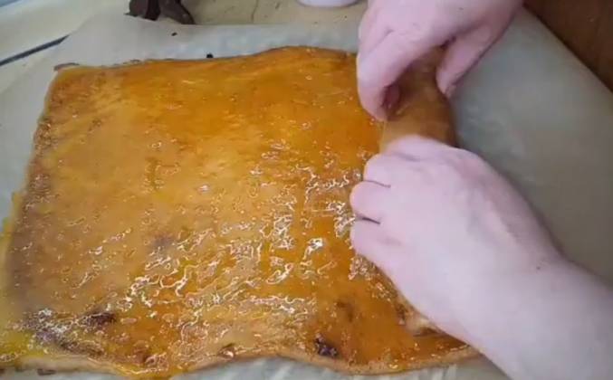 2. Проверяйте на чистую зубочистку. Полотенце увлажняем и готовый, но пока горячий переворачиваем на полотенце, снимаем бумагу и сворачиваем в горячем виде в рулет.