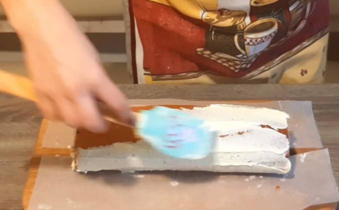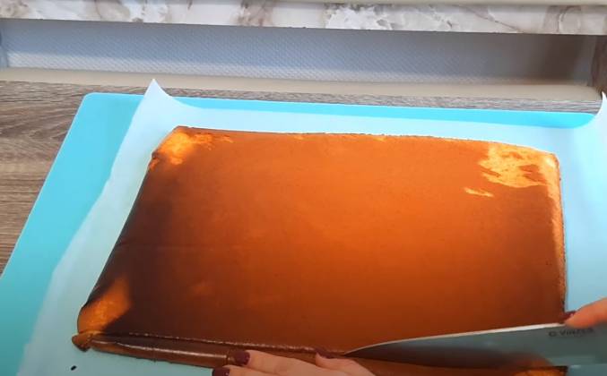 3. Вот такой вот корж у меня получился. Теперь я его сразу же накрываю пергаментной бумагой и переворачиваю. Вот с этой стороны у меня немного перепекся он, но это особенности моей духовки. Теперь я срезаю бока. Корж я еще раз перевернула, просто хочу чтобы верхняя часть была внутри рулета ,так он лучше пропитается. Верхняя корочка обычно прилипает к пергаментной бумаге, но это обычное явление, по крайней мере у меня всегда так, и теперь, пока он еще горячий, сворачиваю рулетом. Накрываю рулет полотенцем и даю ему в таком виде полностью остыть . Теперь готовлю заварной крем. В кастрюльку вбиваю яйцо, всыпаю сахар и хорошенько растираю, теперь добавляем крахмал и также хорошо смешиваю и теперь уже добавляю молоко. Крем завариваем постоянно помешивая. Крем хорошо загустел, значит он готов. Выключаю огонь, накрываю крем пищевой пленкой в контакт и остужаю. Когда заварная основа остыла, начинаю готовить крем ,для этого масло комнатной температуры я хорошо взбиваю и затем по одной ложке добавляю заварную основу.