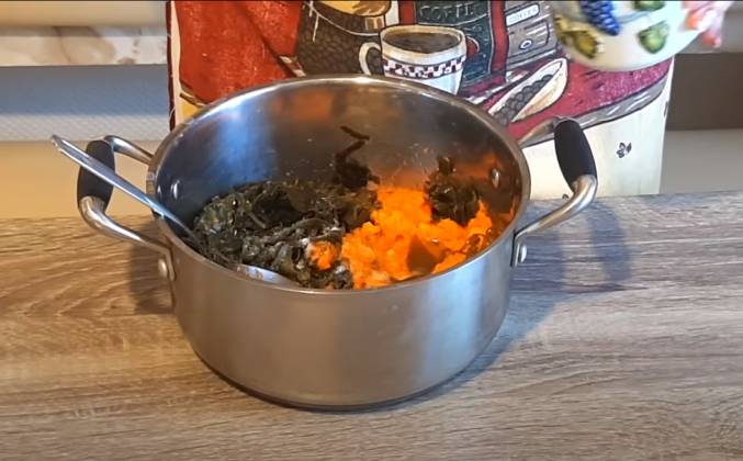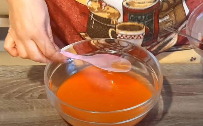 2. И тоже самое делаю со свеклой, но от свеклы жмых я использовать не буду, здесь нам нужен только свекольный сок. Теперь к морковке я добавляю морскую капусту и заливаю водой, чтобы это все было покрыто. И обязательно подсаливаю. Теперь это необходимо вскипятить и проварить 5 минут. Помешиваю, чтобы ничего не подгорело и довожу до кипения, когда закипело, делаю маленький огонь и провариваю ровно пять минут. Пять минут прошло, огонь выключаю и даю всему этому остыть до комнатной температуры. Теперь желатин быстрорастворимый я заливаю холодной кипяченой водой, хорошенько размешиваю и оставляю буквально на 5-7 минут, чтобы он набух. Масса остыла и я ее также будут процеживать. К этой жидкости добавляю сок морковки и теперь по чуть-чуть сок свеклы, сока свеклы надо совсем чуть-чуть, поэтому не переборщите сразу и добавлять его по пол чайной ложечки и смотрите, чтобы цвет стал похожим на цвет красной икры. Вот мне кажется уже приблизительно тот необходимый нам цвет, добавляю в массу растопленный на водяной бане желатин, хорошенько размешиваю и смесь готова.