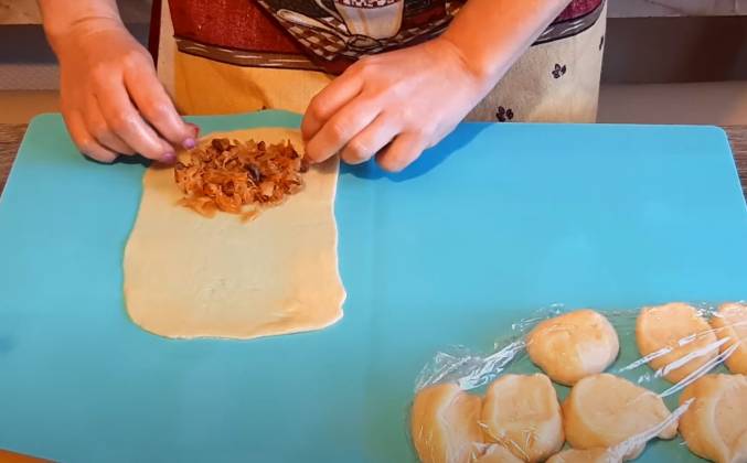 2. Накрываю пищевой пленкой и оставляем постоять при комнатной температуре примерно полчаса. Итак прошло полчаса, тесто еще раз хорошо размешиваю, делаю из него вот такую вот колбаску и разделяю на равные части. Теперь каждую часть я тонко раскатаю вот в такой вот прямоугольный пласт, выкладываем начинку это у меня тушеная квашеная капуста, и формирую вот такой вот пирожок.