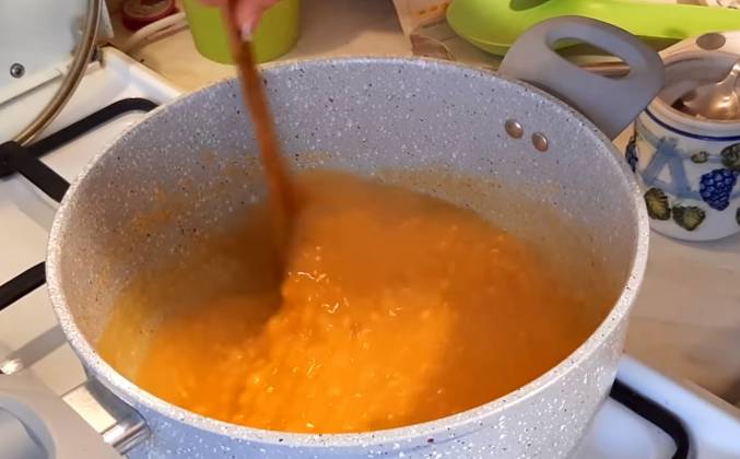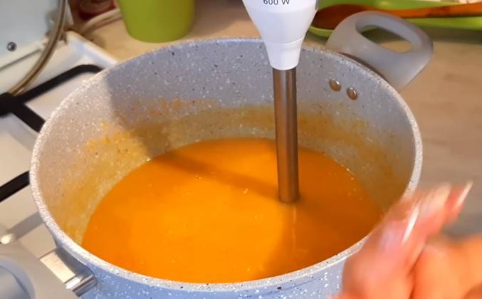 3. Вот прошло еще 15 минут и в общем-то горох уже и готов, вы видите очень и очень быстро, без всякого замачивания, мы потратили буквально минут 30-35 на приготовление горохового пюре, теперь горох я солю и добавляю куркуму, куркуму естественно добавляйте по желанию, нам очень нравится, кроме того куркума очень полезная. Все хорошо размешиваем и так как мы любим гороховое пюре абсолютно однородным, то я все взобью блендером прямо в кастрюле, превращаю все в однородную массу. Единственно блендер не поднимайте, чтобы пюре не брызгало и вы не обожглись. Пюре я взбила, вот такое вот оно абсолютно однородное получилось и естественно его можно подавать именно как пюре, а можно охладить и затем используют как начинку для пирожков, это уже по вашему желанию.Видео рецепт ютуб ниже 👇