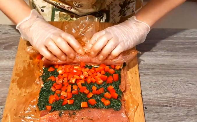 3. Также подготовлю болгарский перчик. И так продолжаем приготовление: мясо уже полежало несколько часов и хорошо промариновалось, это конечно же можно сделать заранее оставить его на ночь и уже на следующий день продолжать готовить, и так на мясо выкладываю сыр вот такими вот пластиночками, сверху распределяю шпинат, старайтесь уложить все одинаковым слоем, и сверху распределяю паприку. И теперь аккуратно начинаю сворачивать рулет Все фиксирую нитками.