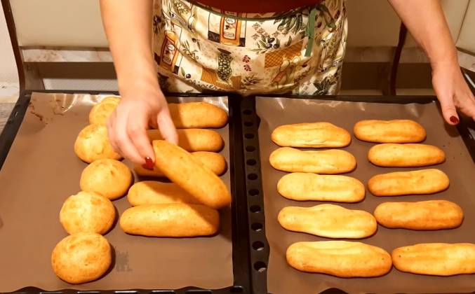 3. Духовку необходимо выключить, дверку слегка приоткрыть и в таком виде дать им полностью остыть. Вот уже две партии эклеров у меня испеклось и я хочу вам показать еще такой нюанс, это первая партия. Естественно я должна была сразу же после выпечки достать их из духовки чтобы выпекать вторую партию, и вот посмотрите они хорошо подросли, но немного потеряли форму, осели после того как я их достала из духовки. Вторую же партию, когда они испеклись я духовку выключила, немного приоткрыла дверцу и прямо в духовке они у меня остыли. Посмотрите они совершенно не я осели и прекрасно сохранили свою форму поэтому если хотите чтобы у вас получились вот такие вот пышные эклеры которые не оседают, то естественно лучше оставлять их в духовке до полного остывания ,также поделюсь с вами лайфхаком: если вы хотите приготовить пирожные или закуску из профитролей, то их можно испечь заранее и заморозить, и уже непосредственно перед праздником вы достаете их из морозилки, размораживайте и заполняете любой начинкой, это очень удобно и экономит время перед праздниками такими например как новый год. когда все таки хочется приготовить много блюд и вот на приготовление именно заготовок вы можете очень хорошо сэкономить время, они уже у вас будут готовы заранее и ждать своего часа.