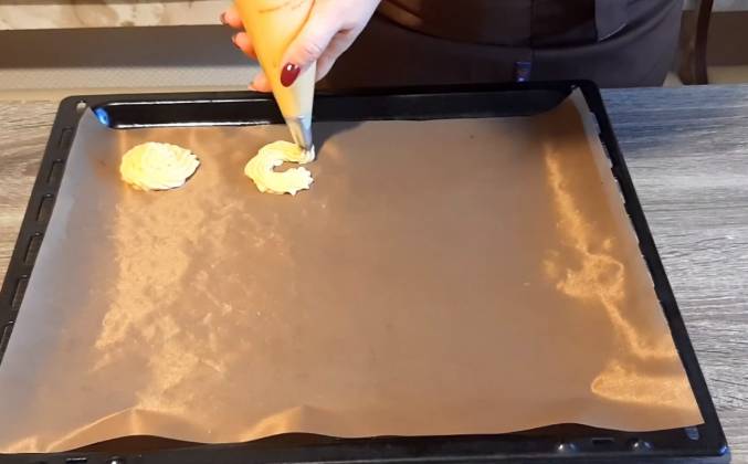 2. Оно начинает толстой лентой у меня сползать вниз, вот это та густота, которая нам нужна, теперь для удобства тесто я переношу в кондитерский мешок, конечно же его можно выкладывать и с помощью ложки, но чтобы пирожные получались одинаковые и более красивые то это удобнее сделать при помощи вот такого вот кондитерского мешка, выдавливаем на противень застеленный тефлоновым ковриком, обязательно оставляю расстояние между ними и теперь чтобы заварные красиво раскрывались и подрастали без трещин я смоченной в воде вилочкой провожу по ним, делаю вот такие вот бороздки. Также я приготовлю маленькие заварные пирожные, которые наполню салатом, это у меня будут так сказать пирожные для закусок. Вот такая вот у меня насадка звезда, я выдавлю небольшие круглые пирожные, не забывайте оставлять расстояние и теперь отправляем в духовку разогретую до 200 градусов на десять минут, затем температуру снижаю до 180 и оставляю еще на 20-25 минут, они должны стать приятного золотистого цвета, на протяжении выпечки духовку ни в коем случае не открываем и когда заварные готовы, чтобы они не опали.
