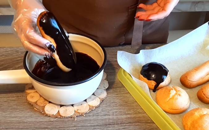 6. Помадку варю на среднем огне постоянно помешивая и когда она закипела, добавляю в нее сливочное масло, даю ему полностью растворится. Масло полностью растворилась и я провариваю помадку еще буквально две минуты на среднем огне постоянно помешивая, даю ей немного загустеть. Прошло 2 минуты и выключаю огонь, помадка готова и я немного ее остужу Помадка у меня остыла и достаточно загустела, пирожные я также перед этим поставила в холодильник и они успели хорошо охладиться, теперь беру каждую пироженку и обмакиваем в глазури Эти пирожные очень универсальны, их можно готовить с различными кремами или подать в качестве закуски с каким-нибудь салатом. Мой сегодняшний вариант самый классический и понравится очень многим! Советую приготовить эти пирожные и вам и приятного всем аппетита!Видео рецепт ютуб ниже 👇