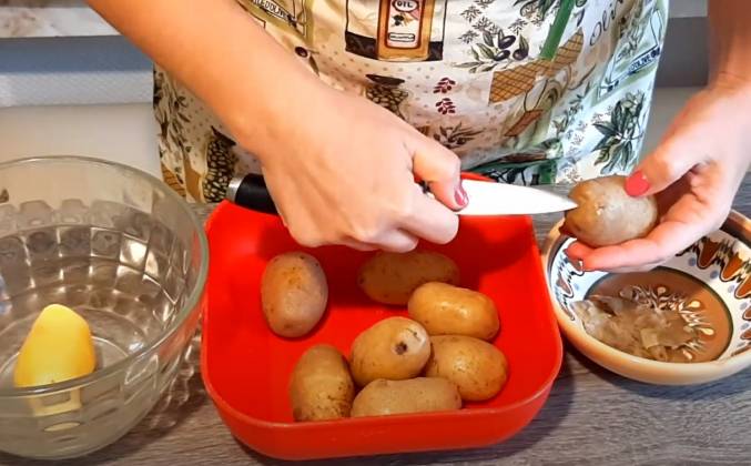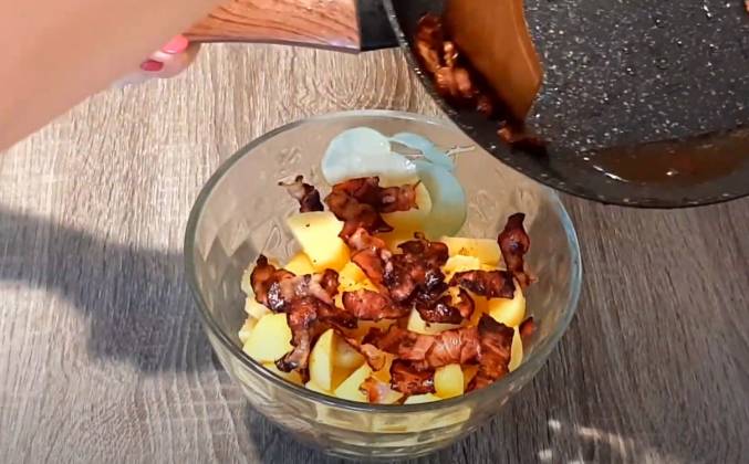 2. Благодаря такой шоковой терапии он хорошо и без проблем очищается. Теперь нарезаю его на кусочки. Бекон я нарезаю на вот такие вот кусочки. Теперь его необходимо обжарить . Сковороду я разогрела на небольшом огне и так как у меня бекон нежирный, добавляю небольшое количество растительного масла и выкладываю кусочки бекона. Обжаренные кусочки бекона я перекидываю к картофелю. А на сковороду отправляют горчицу и маринад из-под огурцов.
