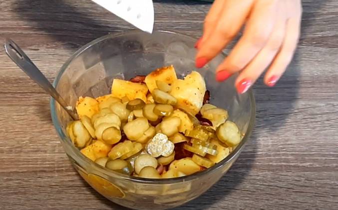 3. Хорошенько все размешиваю, делайте это на минимальном огне, потому что все очень брызгается. Выливаю на сало и картофель, солю, перчу, аккуратно размешиваю и даем настояться. А пока я буду нарезать огурцы и зелень. Маринованные огурцы нарезаю колечками. Измельчаю зелень. И салат готов!Видео рецепт ютуб ниже 👇