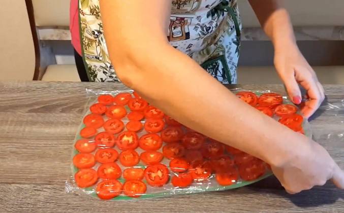 2. Теперь я беру вот такие вот досочки и обтягиваю их пищевой пленкой, конечно же подойдут любые досочки деревянные и пластиковые, просто такие занимают гораздо меньше места и их легче расположить в камере. И теперь располагаем кружочки помидор естественно в один слой. В таком виде отправляем в морозильник до полного замерзания. У меня прошла ночь, помидоры хорошо заморозились их теперь можно перекладывать в пластиковый контейнер или в пакет. Это как вам удобнее.