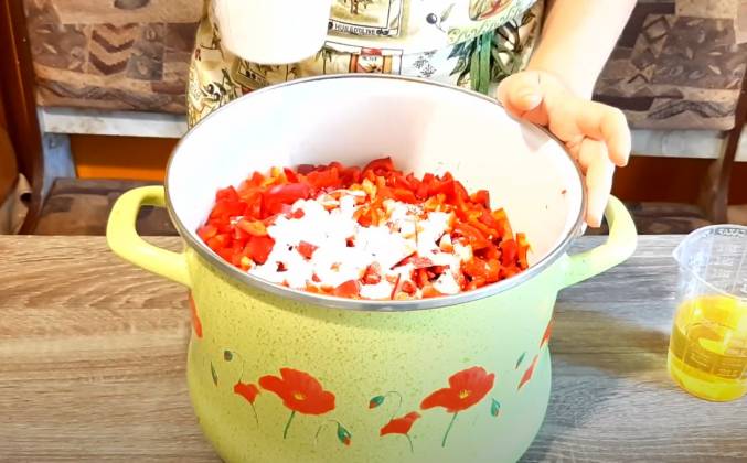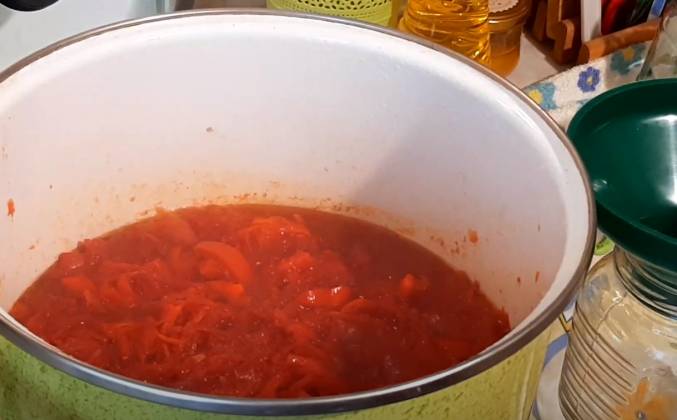 2. Все закипело, делаю маленький огонь, накрываю крышкой и засекаю примерно 30-40 минут. Прошло 40 минут, все овощи хорошо потушились, добавлял к ним уксус, размешиваю и выключаю огонь. Сразу же перекладываю в чистые стерилизованные банки и закручиваю. Как обычно банки переворачиваю, укутываю и оставляю до полного остывания.