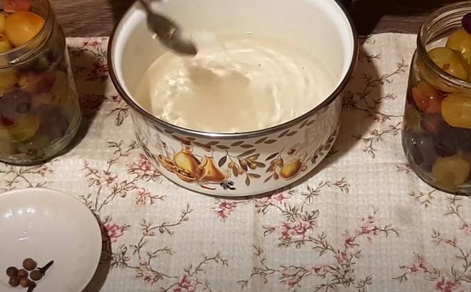 3. Прошло еще 10 минут, снова сливаю воду, добавляю в нее соль, соль берите самую обычную каменную, именно она подходит для консервации. Добавляю сахар, а также душистый горошек и гвоздику и ставлю на огонь, чтобы это все закипело. Когда маринад закипел, добавляю в него уксус, хорошо размешиваю и заливаю виноград. Сразу закручиваю банки и как обычно банки переворачиваем и укутываем в теплое полотенце на 4 часа.Видео рецепт ютуб ниже 👇