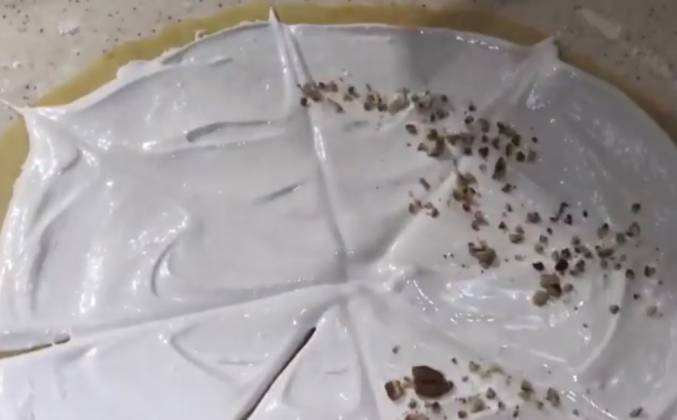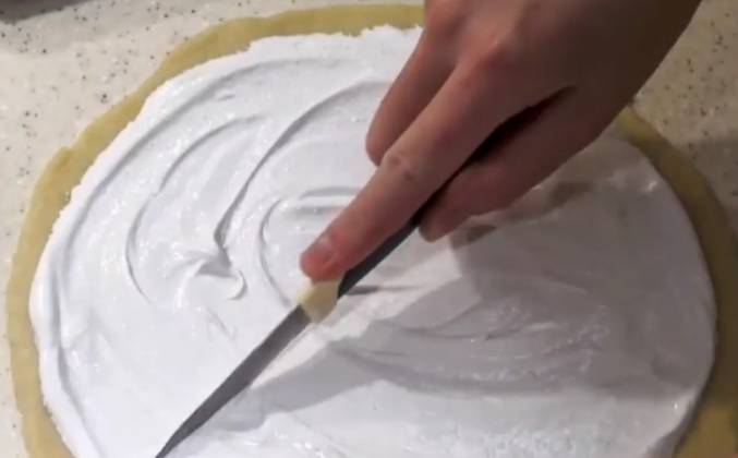 2. Достаньте тесто из холодильника, разделите его на 3 части (я разделила в этот раз на 2, не делайте так, слишком уж они большими получились). Каждую часть нужно раскатать тонко в круг, смазать безе (1/3 соответственно, чтоб хватило на всё тесто), посыпать орешками, разрезать на 8 частей (треугольников).