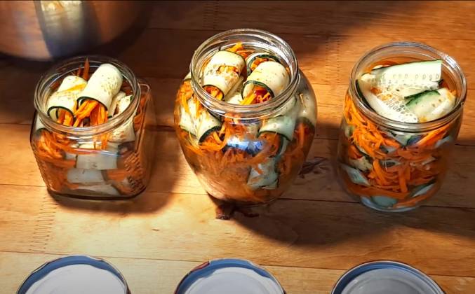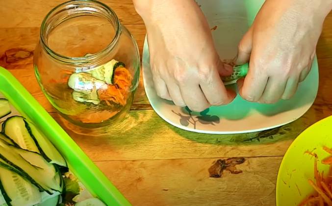 2. Теперь срезаю у огурчика вот эти части и нарезаю их тонкими пластинами, это можно сделать при помощи вот такой вот овощечистки, но у меня терка с разными насадками и я буду делать с помощью терки. Вот такие вот пластинки примерно толщиной полтора миллиметра должны получиться, теперь на дно банки я укладываю лавровый листик, душистый перец и несколько горошин черного перца. Теперь на пластину укладываю корейскую морковку, заворачиваю рулетик, рулетик делайте как можно туже и укладываю в банку. Рулетики плотно складываю друг к другу. А если у вас уже не хватит терпения готовить рулетики, вы просто укладывайте все слоями: огурчики и морковка. И теперь готовлю маринад.