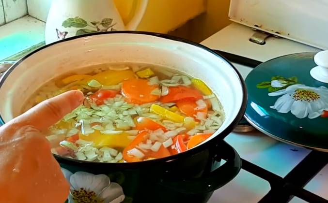 2. Лук я нарезала не очень мелко, а вот в овощах идет очень крупная нарезка и нужно опять же рассчитать по количеству людей. В каждой тарелки должна оказаться морковка, картошка, картошку лучше подобрать небольшую, чтобы она была целенькая в шурпе, но у меня не было небольшого размера, поэтому я разрезала ее пополам. Перец у меня красный и желтый, поэтому тоже в каждой тарелки должен быть и такой, и такой кусочек. Итак отправляюсь к плите и буду все это закидывать в кастрюлю. Пока варилось мясо, вода довольно сильно испарилась, но так и должно быть. Воду не добавляйте! Закидываю в кастрюльку все наши овощи, делаю большой огонь и довожу до кипения.