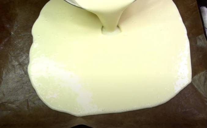 2. Берем стандартный противень от духовки у меня размер противня 38 см на 32 см Застелем бумагой для выпечки, рекомендую брать антипригарный коврик для выпечки без масла, если нет такого коврика то нужно застелить противень обычной бумагой для выпечки смазать маслом и посыпать мукой. Ставим в разогретую духовку и выпекаем 15 минут или ориентируйтесь по своей духовке. Блин в духовке будет пузыриться так и должно быть, потом он станет ровным, как только духовка откроется.
