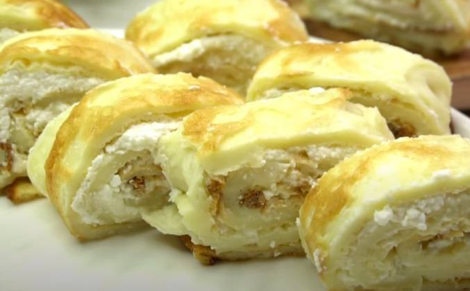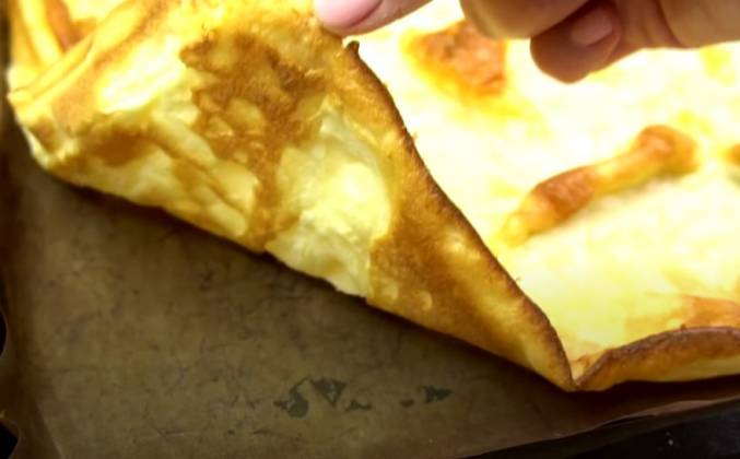 3. Достаем из духовки, блин уже готово можно его смазать сливочным маслом и подать к столу. Я люблю блинчики с творогом, поэтому делаю так. Творог 150 грамм перемешиваю со сметаной и сахаром. Кладем на блин равномерно распределяем и сворачиваем рулет. Теперь нарезаем и подаем горяченький к столу. Можно просто смазать сливочным маслом и свернуть рулет. Или полить джемом. В общем все на Ваше усмотрение.Видео рецепт ютуб ниже 👇